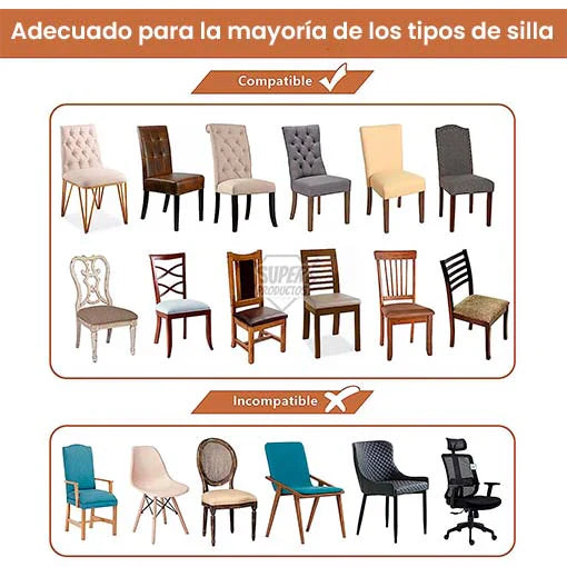 Se adaptan fácilmente a casi cualquier tipo de silla de comedor.Solo necesitas 1 minuto para instalarla, gracias a sus bandas permanecerán en su lugar. También evita golpes y marcas de la silla en piernas y espalda.